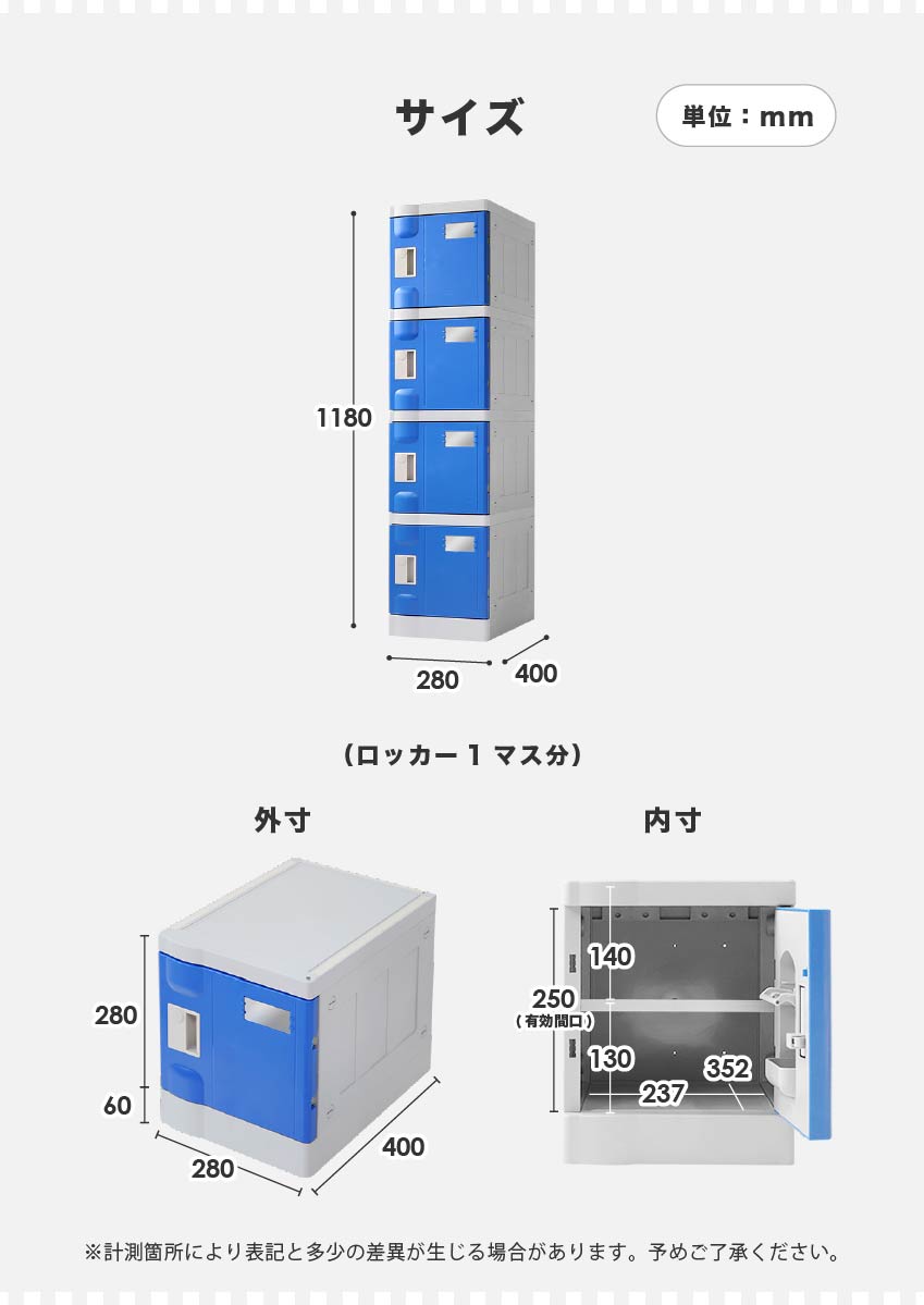 | 付属品 | ※扉の有無、鍵の種類により異なります。 オープン:穴隠しキャップ(1マスにつき4個) シリンダー錠:鍵(1マスにつき2本) 電子錠:通常キー(1マスにつき1本) |