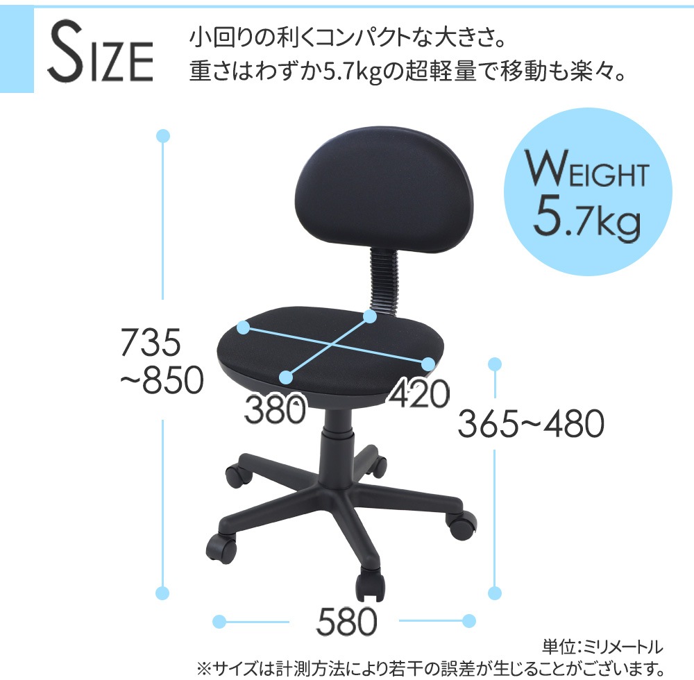 | サイズ | 外寸:幅580×奥行480×高さ735~850(座面高365~480)mm 重量:5.7kg 梱包サイズ:幅530×奥行510×高さ200mm |