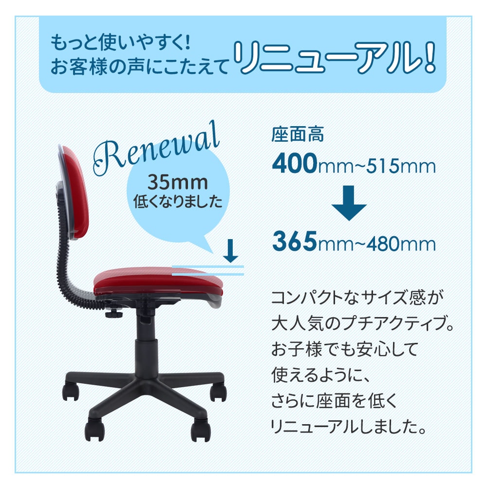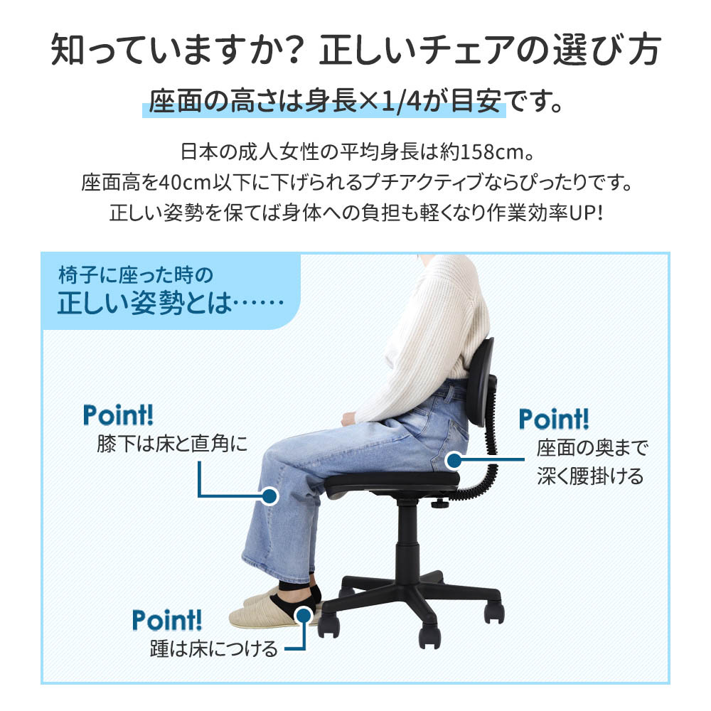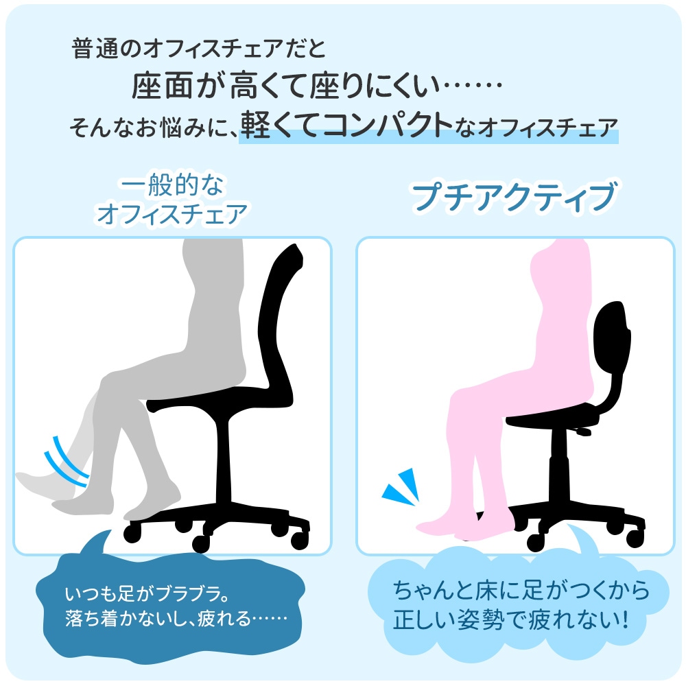 女性やお子様にも最適なコンパクトチェア。 最低座面高36.5センチと通常のオフィスチェアに比べて座面が低めだから小柄な方やお子様にもぴったり。普通のオフィスチェアだと座面が高くて座りにくい・・・そんなお悩みを解決します。 小さめサイズだから、ご家庭でのお子様の学習椅子や、塾などにも最適。 超軽量でキャスター付きなので移動も楽々。 座る人に合わせた高さに調整できるガス圧リフト昇降機能、背の動きに合わせて背もたれが可動する背チルト機能と、コンパクトだけれど機能はしっかり。 シンプルなデザインだから、オフィスでもご家庭でも、場所を選ばず大活躍します。インテリアに合わせて選べる4色をご用意しました。 コスパチェアの新定番、プチアクティブ登場です。 |