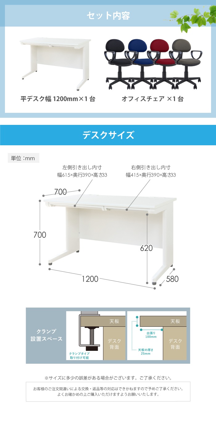 | サイズ | デスク 外寸:幅1200×奥行700×高さ700mm 左側引き出し内寸:幅615×奥行390×高さ33mm 右側引き出し内寸:幅415×奥行390×高さ33mm 天板厚み:約25mm 幕板から天板先までの長さ:約100mm チェア 外寸:幅580×奥行480×高さ735~850(座面高365~480)mm ※こちらのチェアはループ肘です。 |