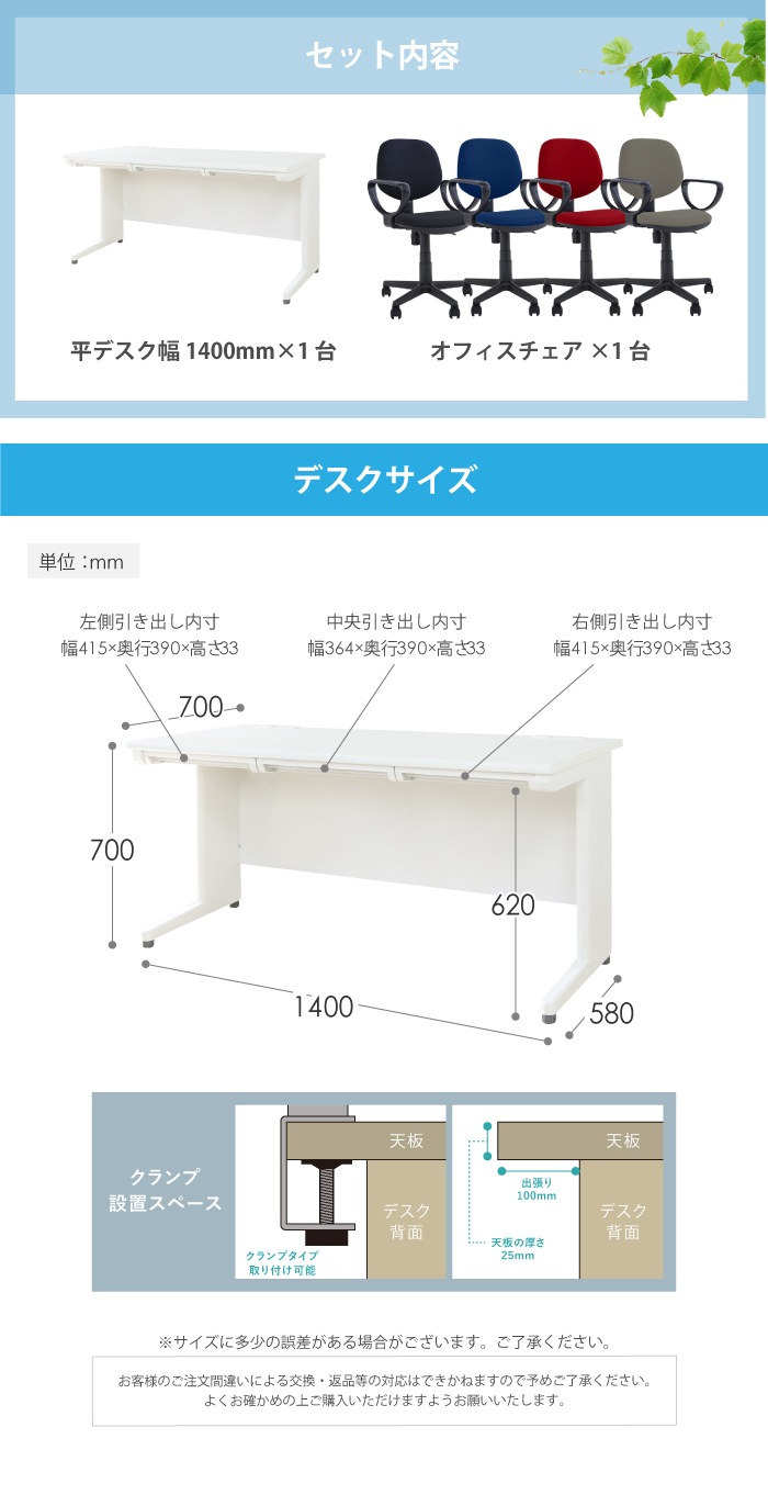 | サイズ | デスク 外寸:幅1400×奥行700×高さ700mm 左側引き出し内寸:幅415×奥行390×高さ33mm 中央引き出し内寸:幅364×奥行390×高さ33mm 右側引き出し内寸:幅415×奥行390×高さ33mm 天板厚み:約25mm 幕板から天板先までの長さ:約100mm チェア 外寸:幅580×奥行500×高さ760~875(座面高375~490)mm ※こちらのチェアはループ肘です。 |