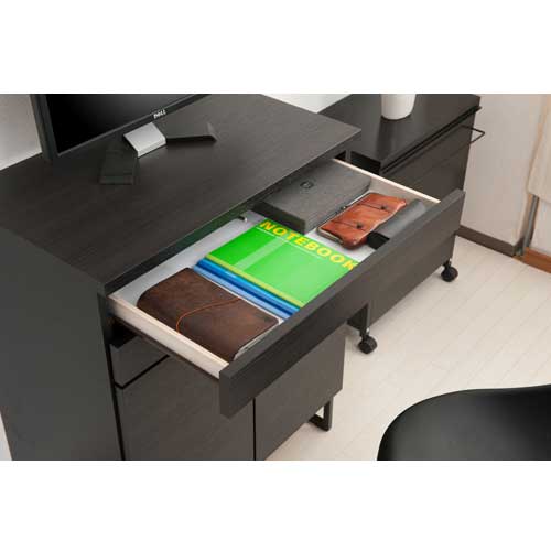 | オールブラックで仕上げたキャビネットは風格のある存在感。 細脚からスタイリッシュに完成されたスクエア感は直線的で黒木目とマッチ。 扉・引出しの構成のキャビネットやローボードに機能的なデスクタイプも加わりリビング空間をカッコよく演出。 ソリッドブラックな脚部や細部に木目の効いた表面材が絶妙なバランス。 引出しはスライドレール付き。 | |
