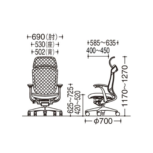 | サイズ | 外寸:幅690×奥行585~635×高さ1170~1270(座面高420~520)mm 肘の高さ:625~725mm 脚部:直径700mm |