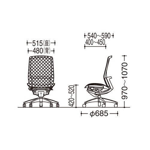 | サイズ | 外寸:幅515×奥行540~590×高さ970~1070(座面高420~520)mm 脚部:直径685mm |