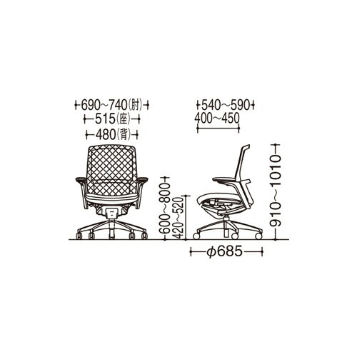 | サイズ | 外寸:幅690~740×奥行540~590×高さ910~1010(座面高420~520)mm 肘の高さ:600~800mm 脚部:直径685mm |