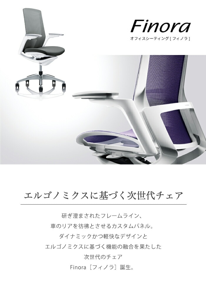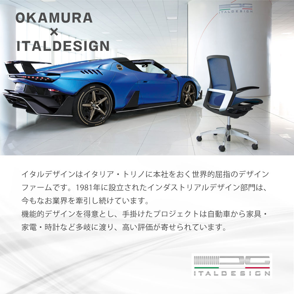 | イタルデザインとのコラボレーションから生まれた次世代のオフィスシーティング「フィノラ」。 イタルデザインはイタリア・トリノに本社をおく世界的屈指のデザインファームで、これまでもオカムラの「Contessa(コンテッサ)」「Sabrina(サブリナ)」などのオフィスチェアを手がけています。 今回が6作目のコラボレーションとなるフィノラは、背からすっと伸びる美しいアームが背から座下へと流れるフレームラインに、車のリアを彷彿とさせるカスタムパネルが特徴的なデザインです。 リクライニングや座面昇降等の各種調節レバーは座面下にすっきりと納められ、自然な姿勢で直感的に操作ができます。 |