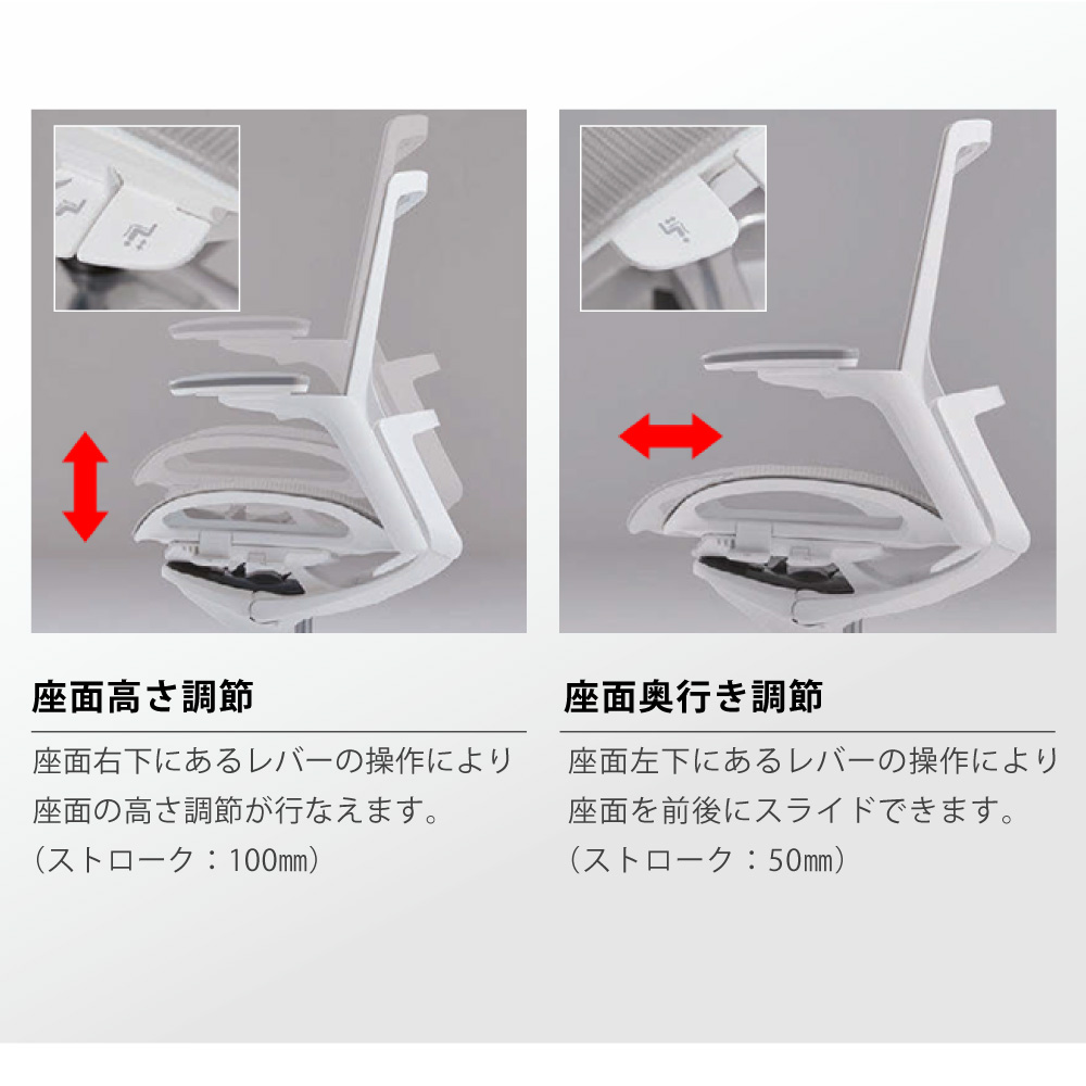座面左下にあるレバーの操作により座面を前後にスライドできます。 (ストローク:50mm) |
