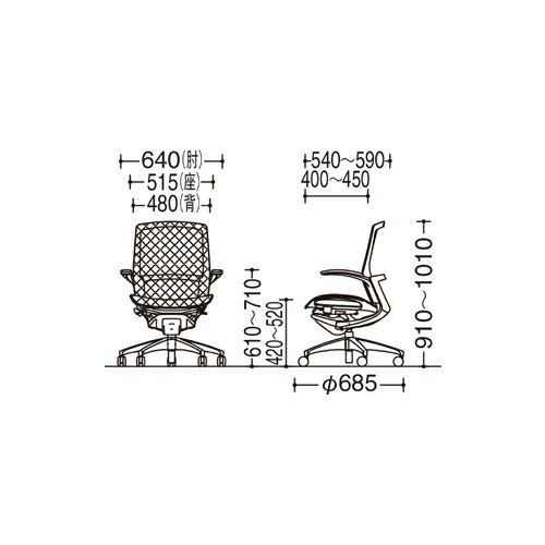 | サイズ | 外寸:幅640×奥行540~590×高さ910~1010(座面高420~520)mm 肘の高さ:610~710mm 脚部:直径685mm |