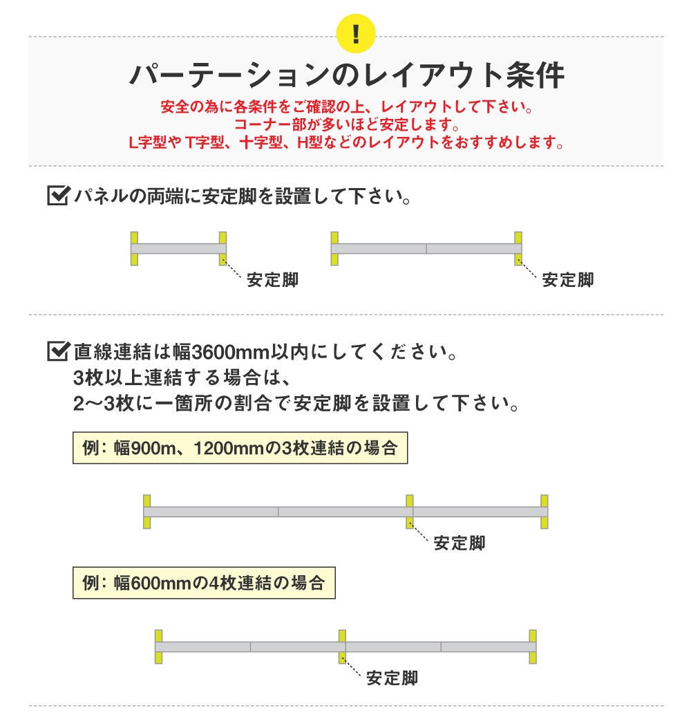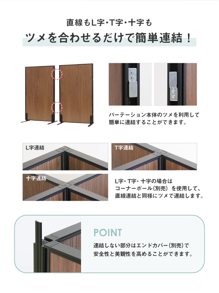 | 仕様 | フレーム:アルミ 板面:ポリカーボネート(半透明) アジャスター:ナイロン ●直線連結 パネル本体のツメを噛み合わせて簡単に連結できます。 ●L字・十字・T字 コーナーポール(別売)が必要です。 コーナーポールはコーナーごとに1本必要です。 |
