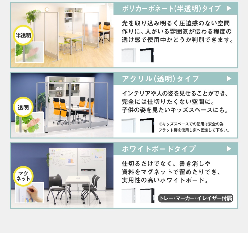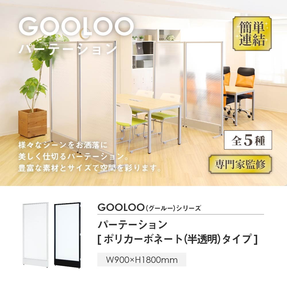 | 【GOOLOOシリーズ】 おしゃれなオフィスで働きたい!を叶えるGOOLOO(グールー)シリーズ。 自然と気分を上げて仕事に取り組めるような、快適で居心地のよいオフィス空間を作ります。 シリーズで揃えれば、一貫性のあるお洒落なオフィスデザインが完成します。 【GOOLOOパーテーション】 パーテーションのツメを噛み合わせるだけで連結ができる、扱いやすい簡単設計。 コーナーポール(別売)を使用すれば、L字・T字・十字・コの字・H字などさまざまなレイアウトが可能! 豊富なサイズ展開、パネルの中からお選び頂け、様々な利用シーンにジャストフィットする空間作りを実現します。 自社開発・監修だからこその品質と価格で優れた性能とコストパフォーマンスを両立! <ポリカーボネート(半透明)> プライペートを保ちつつも光を取り込み、明るい空間を作ります。 人がいる雰囲気が伝わる程度の透け感で、使用中かどうか判別できます。 汚れが気になる時は固く絞った濡れた布でお手入れでき、衛生的にお使いいただけるのも嬉しいポイント。 ※エタノールなどの溶剤は使用しないでください。表面に細かいヒビが入ったり白くなる恐れがあります。 | |