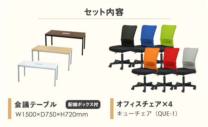 | 特記事項 | セット内容:会議テーブル(NF-GLM-1575H)×1、オフィスチェア(NF-QUE-1)×4 |