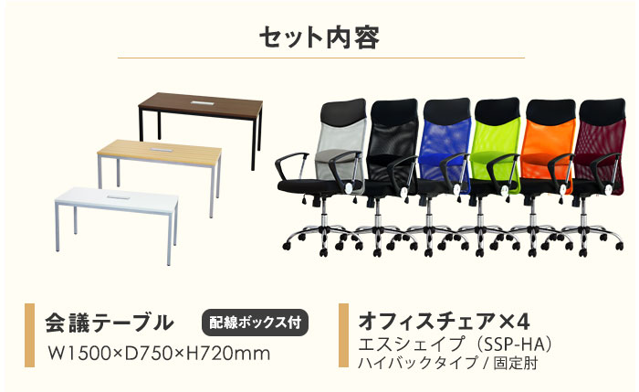 | 特記事項 | セット内容:会議テーブル(NF-GLM-1575H)×1、オフィスチェア(NF-SSP-HA)×4 |