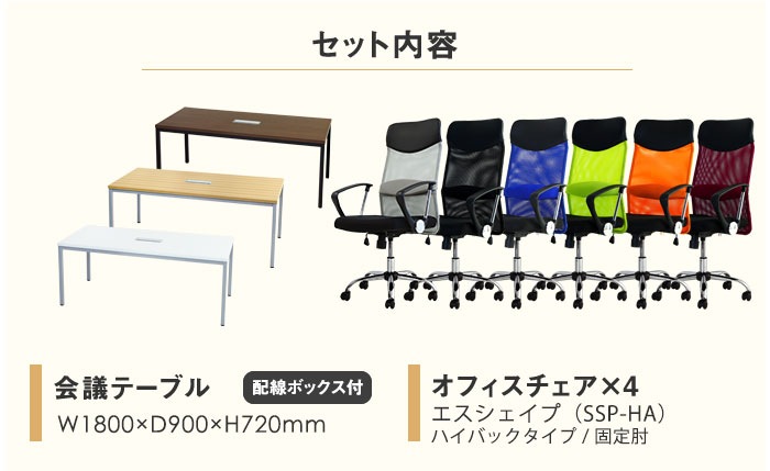 | 特記事項 | セット内容:会議テーブル(NF-GLM-1890H)×1、オフィスチェア(NF-SSP-HA)×4 |