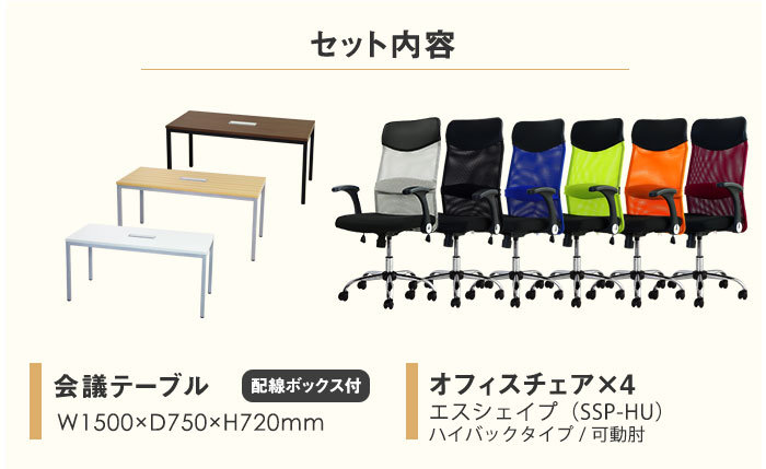 | 特記事項 | セット内容:会議テーブル(NF-GLM-1575H)×1、オフィスチェア(NF-SSP-HU)×4 |