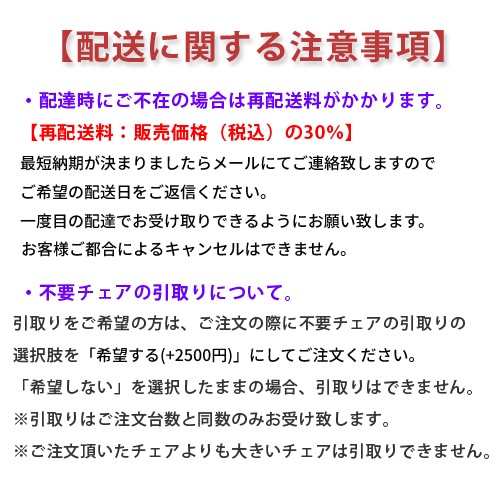 | 配送の注意事項 | ※お届けの際は指定箇所への搬入設置、梱包材回収を行います。 ※配達時にご不在の場合は再配送料(販売価格税込の30%)がかかります。 ※受注生産の為、発送まで2~2.5ヶ月お時間を頂きます。 |