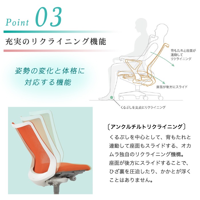 | オカムラ独自の新機能と基本調節機能がフルに搭載さた新感覚のメッシュチェア。 人間工学の視点に基づく知見を活かし、新たに「ラウンドフィットバック」が開発されました。 小柄な人でも大柄な人でもフィットしやすい腰まわりのカーブで、まるで包み込まれるような座り心地が感じられます。 他にも座った瞬間の衝撃を吸収する「ブリッジベンディングシート」など、より上質な座り心地を追求した機能が搭載されています。 |