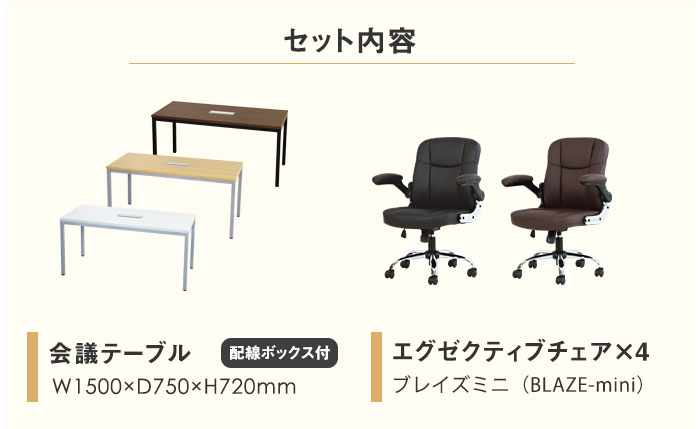 | 特記事項 | セット内容:会議テーブル(NF-GLM-1575H)×1、エグゼクティブチェア(NF-BLAZE-mini)×4 |