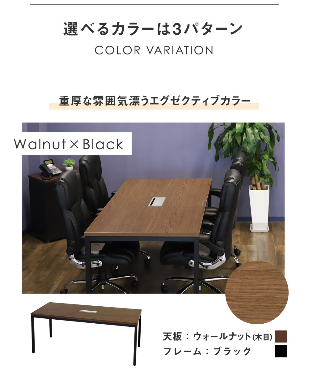 | カラー | ■会議テーブル シルバーフレーム×ホワイト天板、シルバーフレーム×ナチュラル天板、ブラックフレーム×ウォールナット天板 ■チェア ブラック、ブラウン |