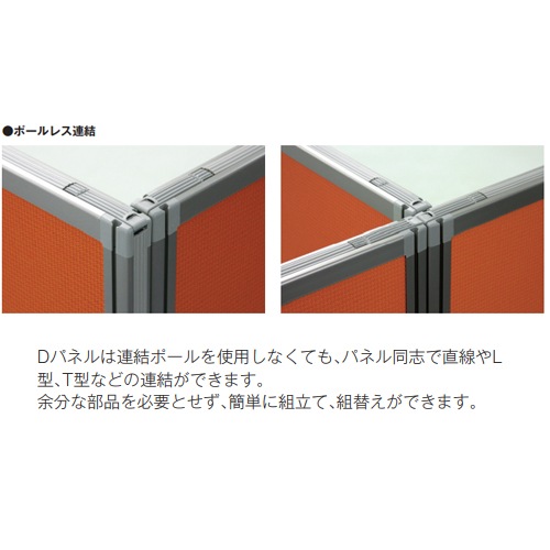 | 軽くて、組立て簡単!環境にも優しいDパネル! ペーパーコア芯とアルミフレーム構造で驚異的な軽さを実現したローパーテーションです。 連結ポールを使用しなくても、パネル同士で直線やL型、T型などの連結ができます。 余分な部品を必要とせず、簡単に組立て、組替えができます。 |