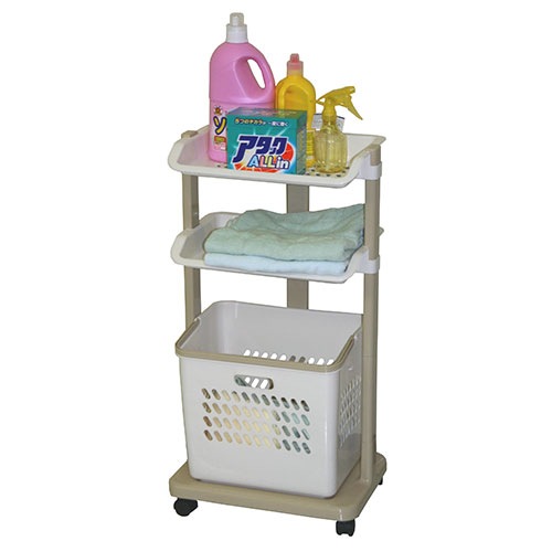 | 脱衣所、更衣室、病院などの診察室に最適なワゴンです。 上段・中段は棚付きなので、ちょっとした小物収納に最適です。 下段には取り外しができる深型の脱衣バスケット付き。 キャスター付きなので移動が簡単にできます。 |