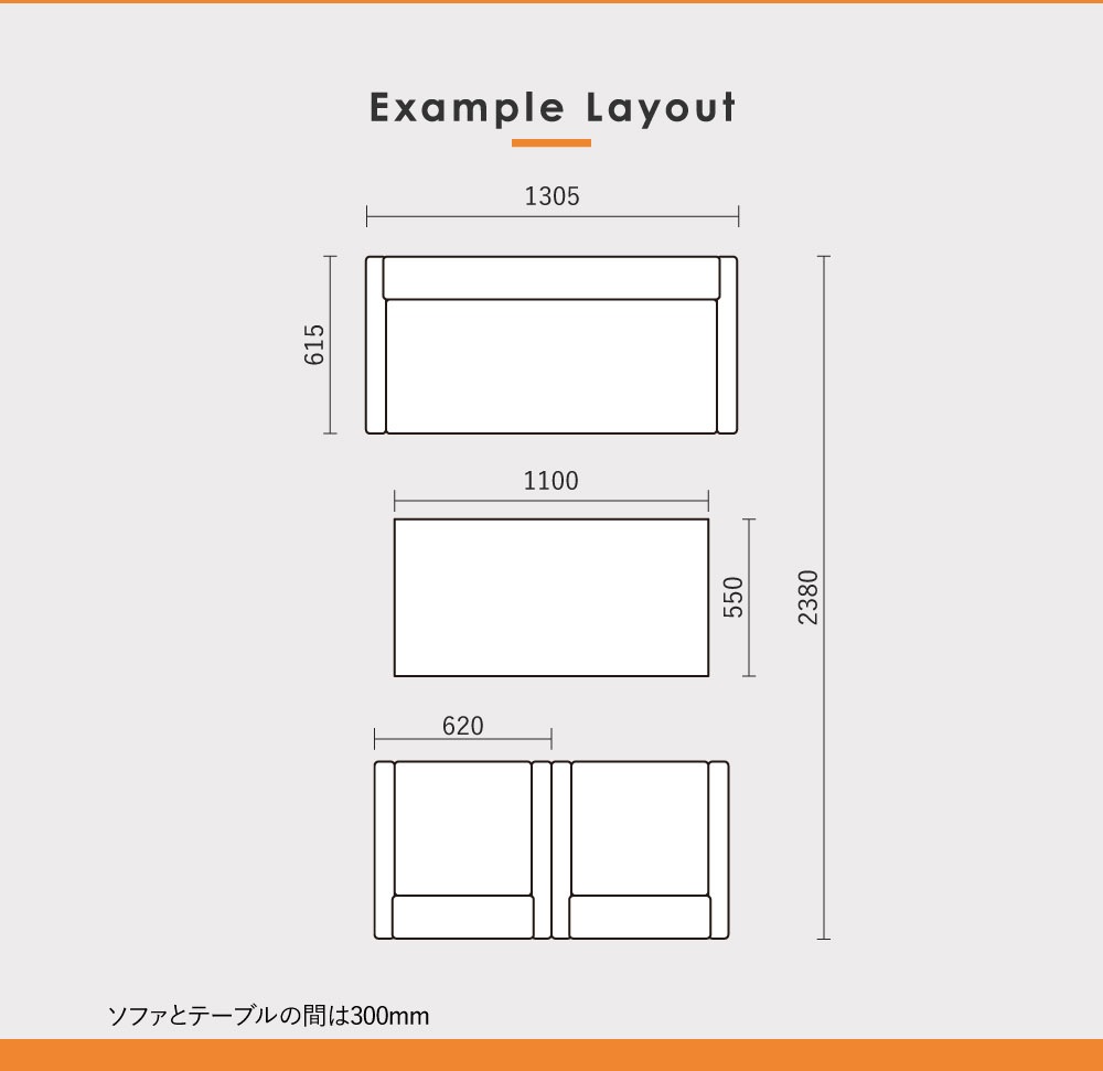 | サイズ | 2人掛けソファ:幅1305×奥行615×高さ710(座面高450)mm 1人掛けソファ:幅620×奥行615×高さ710(座面高450)mm センターテーブル:幅1100×奥行550×高さ450mm |