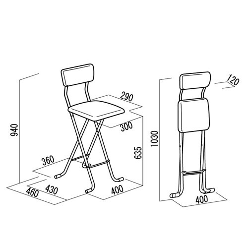 | サイズ | 外寸:幅400×奥行460×高さ940(座面高635)mm 折りたたみ時:幅400×奥行120×高さ1030mm 重量:3.5kg 耐荷重:80kg |