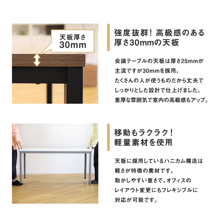 ■会議テーブル 【天板】表面:合成樹脂化粧板(メラミンエンボス加工)、芯材:MDF+ハニカムコア、エッジ:PVC 【脚】角スチールパイプ(粉体塗装) 均等耐荷重:60kg アジャスター付き ■チェア 背座:ポリプロピレン、張地:PVCレザー(塩化ビニール)・ウレタンフォーム、フレーム:スチール(粉体塗装) キャスター:ナイロン |