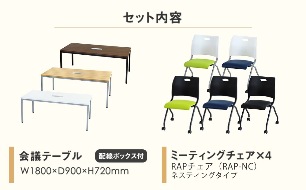 | 特記事項 | セット内容:会議テーブル(NF-GLM-1890H)×1、ミーティングチェア(NF-Rap-NC)×4 |