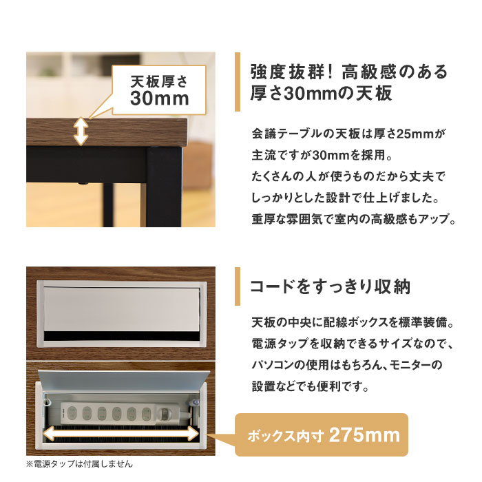 ■会議テーブル 【天板】表面:合成樹脂化粧板(メラミンエンボス加工)、芯材:MDF+ハニカムコア、エッジ:PVC、配線ボックス:アルミニウム 【脚】角スチールパイプ(粉体塗装) 均等耐荷重:60kg アジャスター付き 配線ボックス付き ■チェア 背座:ポリプロピレン、張地:PVCレザー(塩化ビニール)・ウレタンフォーム、フレーム:スチール(粉体塗装)、キャスター:ナイロン |