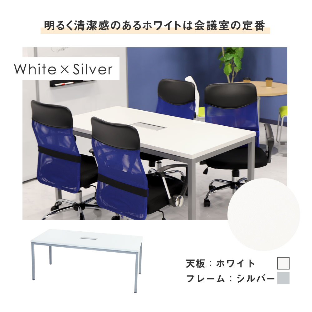 ■会議テーブル シルバーフレーム×ホワイト天板、シルバーフレーム×ナチュラル天板、ブラックフレーム×ウォールナット天板 ■チェア 座面:グリーン、ネイビー(背:ホワイト ) 座面:グリーン、ネイビー、ブラック(背:ブラック) |