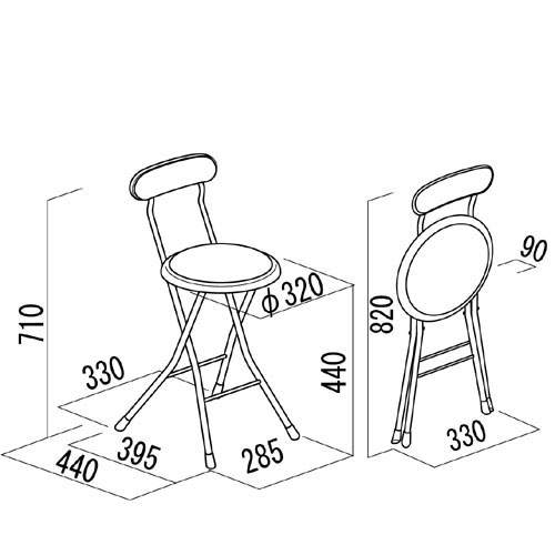 | サイズ | 外寸:幅330×奥行440×高さ710(座面高440)mm 折りたたみ時:幅330×奥行90×高さ820mm 重量:2.6kg 耐荷重:80kg |