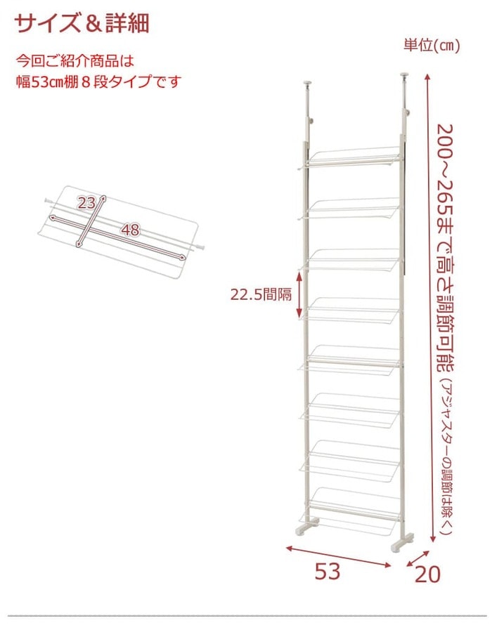 | サイズ | 外寸:(約)幅53×奥行22.5×高さ200~265cm 脚部アジャスター調節範囲:(約)1cm 棚間隔:(約)23cm 重量:(約)8kg |