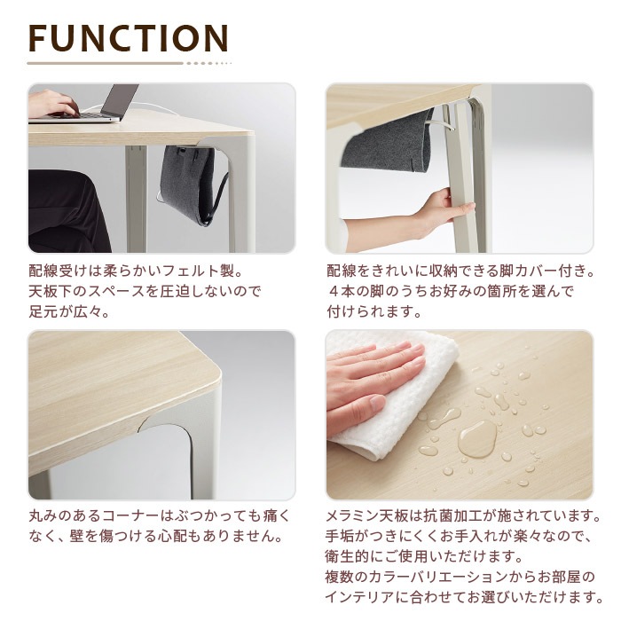 天板/表面材:メラミン化粧板 縁材:樹脂成型品 芯材:スチール 天板厚:26mm 脚/スチール塗装仕上げ アジャスター付 脚カバー/スチール マグネット付 配線受け/不織布 |