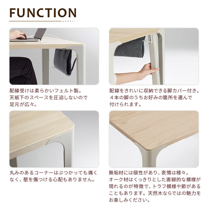 天板/表面材:オーク無垢材UV塗装仕上げ 天板厚:26mm 脚/スチール塗装仕上げ アジャスター付 脚カバー/スチール マグネット付 配線受け/不織布 |