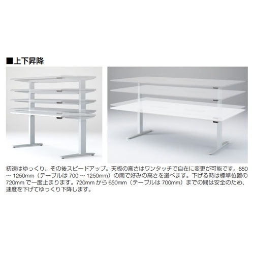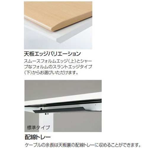 天板表面材/メラミン化粧板 縁材/樹脂成型品(ABS) ●上下昇降 ●セーフティリバース ●配線トレー付 ●配線口カバー(3口)2個付 ●左右スペーサー標準装備 ●メモリー機能 ●抗菌天板(ホワイトのみ) |