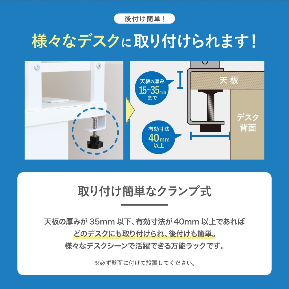 | 縦の空間を有効活用。様々なデスクに取り付けられる机上ラック。 書類などをスッキリと収納できる2段の大容量収納で、デスク周りをらくらく整頓できます。 A4サイズの書類がすっきり入り、なおかつ机上を圧迫しない省スペースでジャストな奥行。 座ったまま上段に収納した書類が取り出せる仕様で、作業効率もアップします。 棚板は高さ調整が可能。用途に合わせて使用できます。 |