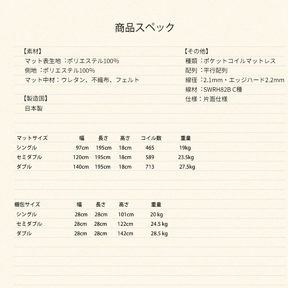 | 備考 | ●日本製(マットレスのみ) |