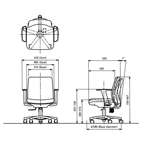 | サイズ | 外寸:幅610×奥行520×高さ755~847(座面高380~472)mm 座面幅:460mm 脚径:直径560mm |