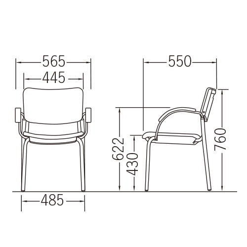 フレーム:直径25.4mm/直径22.2mmスチールパイプ、粉体塗装 背・座:ポリプロピレン樹脂成型品、取っ手付、ウレタンフォーム 肘:ラバーウッド成型合板 張地:ビニールレザー 平積み脚数:6脚スタッキング可能 |