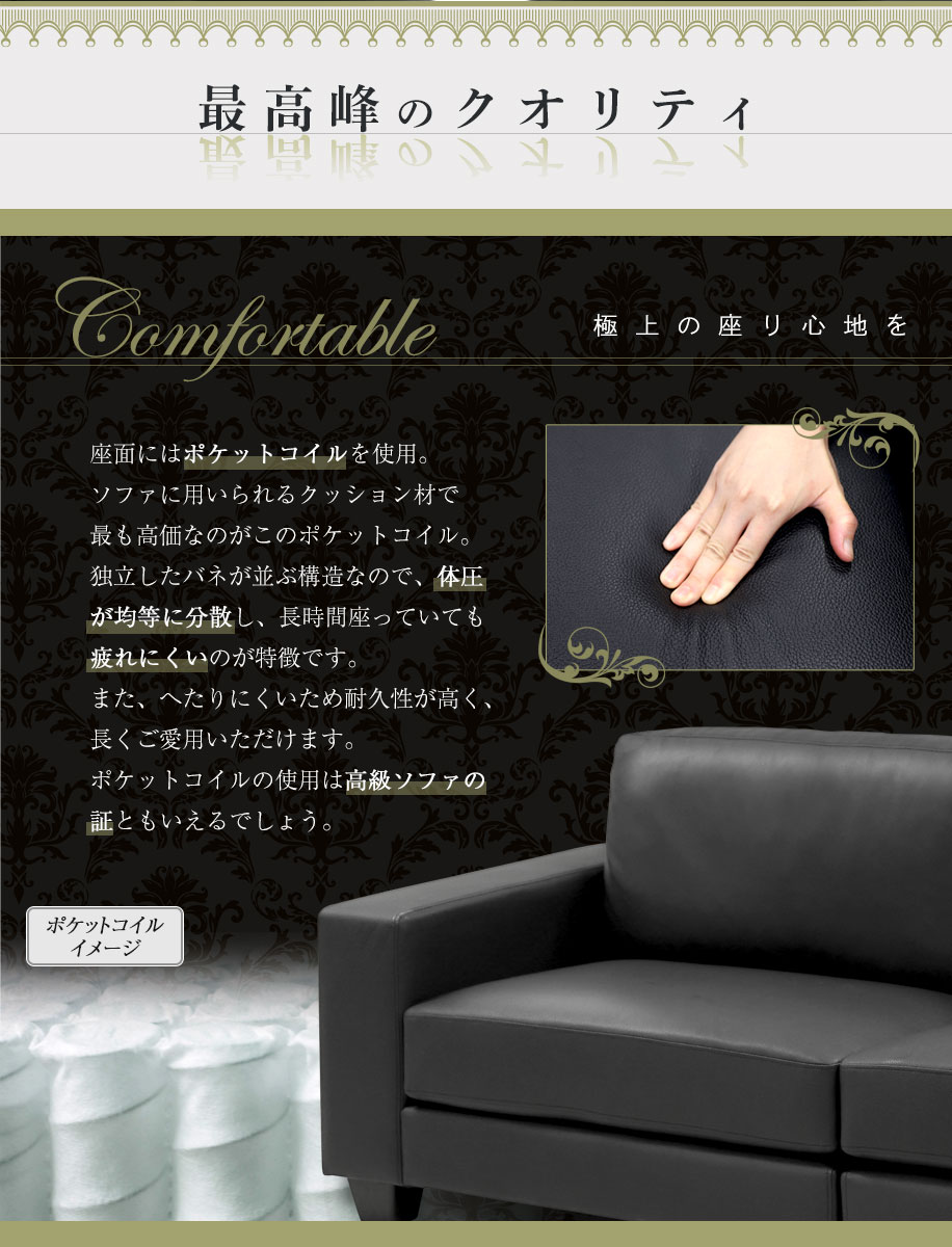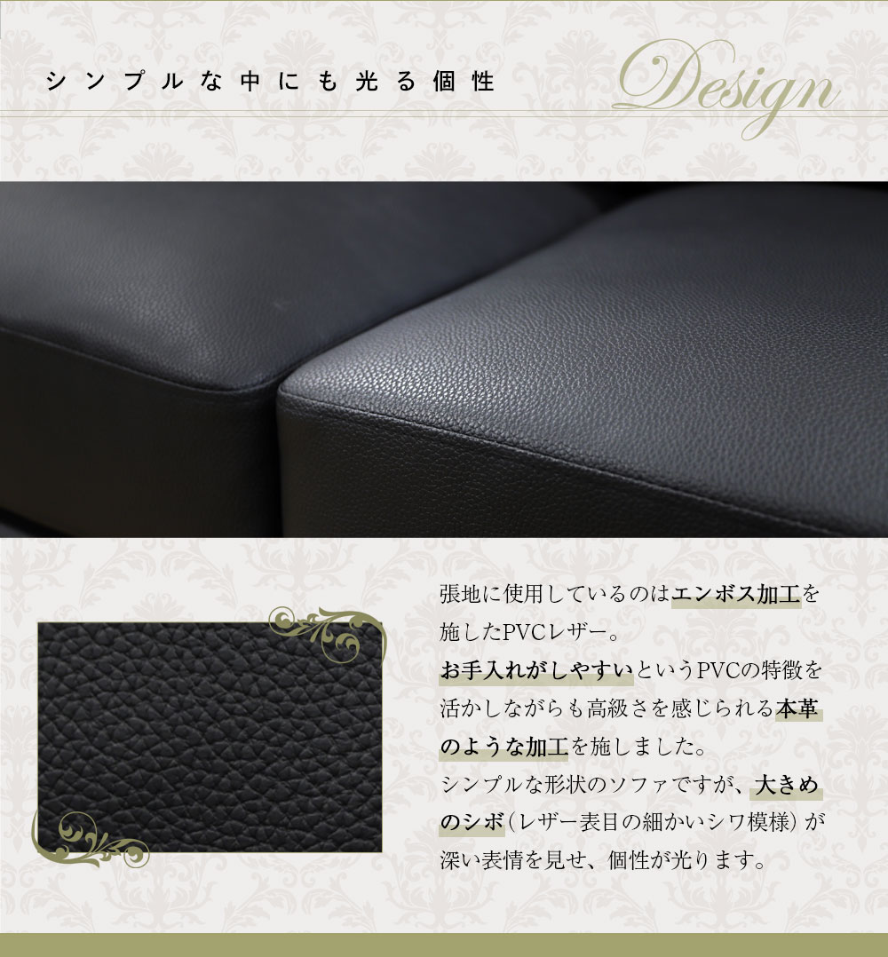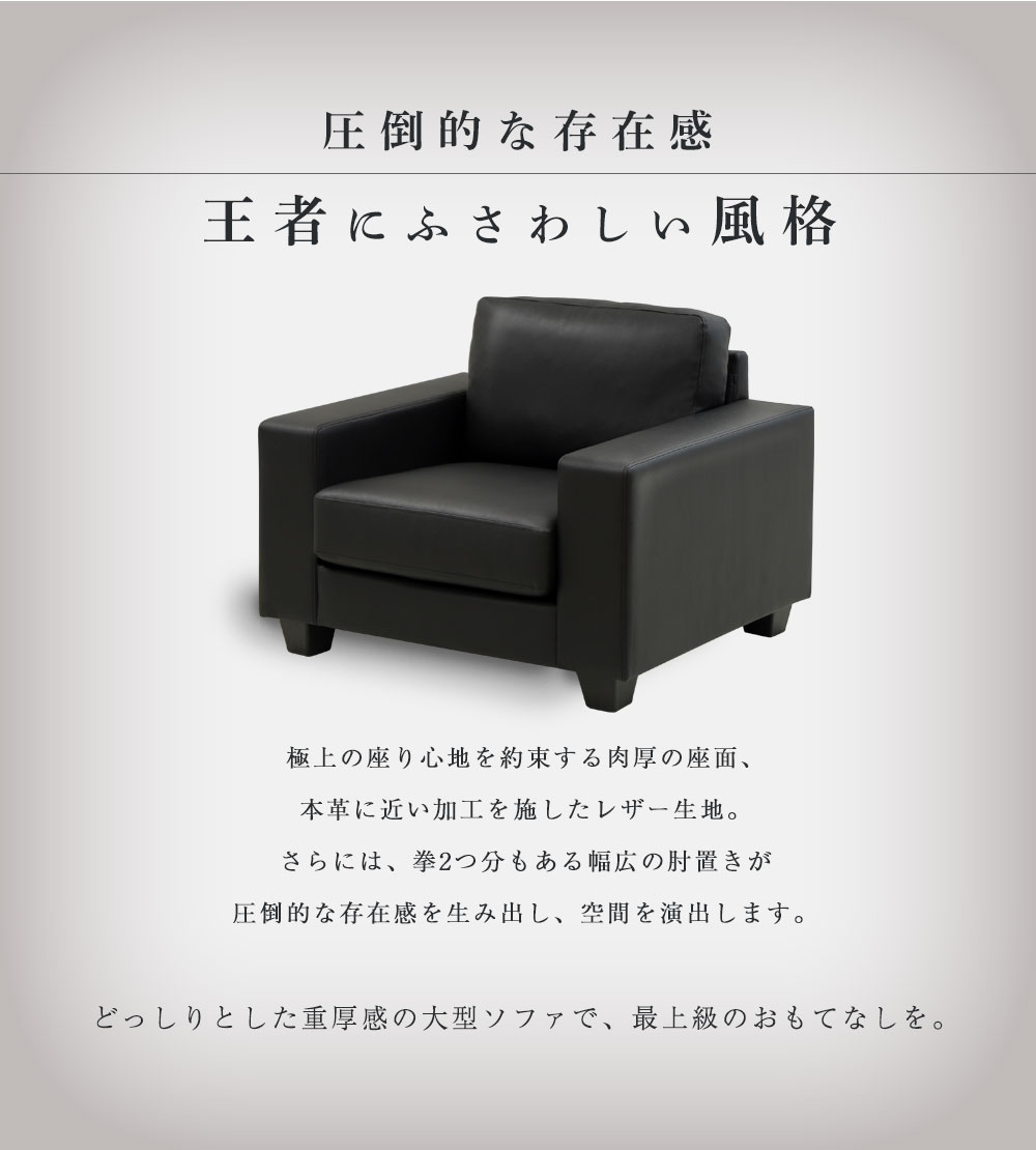 極上の座り心地を約束する肉厚の座面、本革のような加工を施したレザー生地。 さらには、拳2つ分もある幅広の肘置きが圧倒的な存在感を生み出し、空間を演出します。 座面にはポケットコイルを使用。体圧が均等に分散し、長時間座っていても疲れにくいのが特徴です。 張地に使用しているのはエンボス加工を施したPVCレザー。大きめのシボ(レザー表目の細かいシワ模様)が深い表情を見せ、個性が光ります。 どっしりとした重厚感の大型ソファで、最上級のおもてなしを。 |