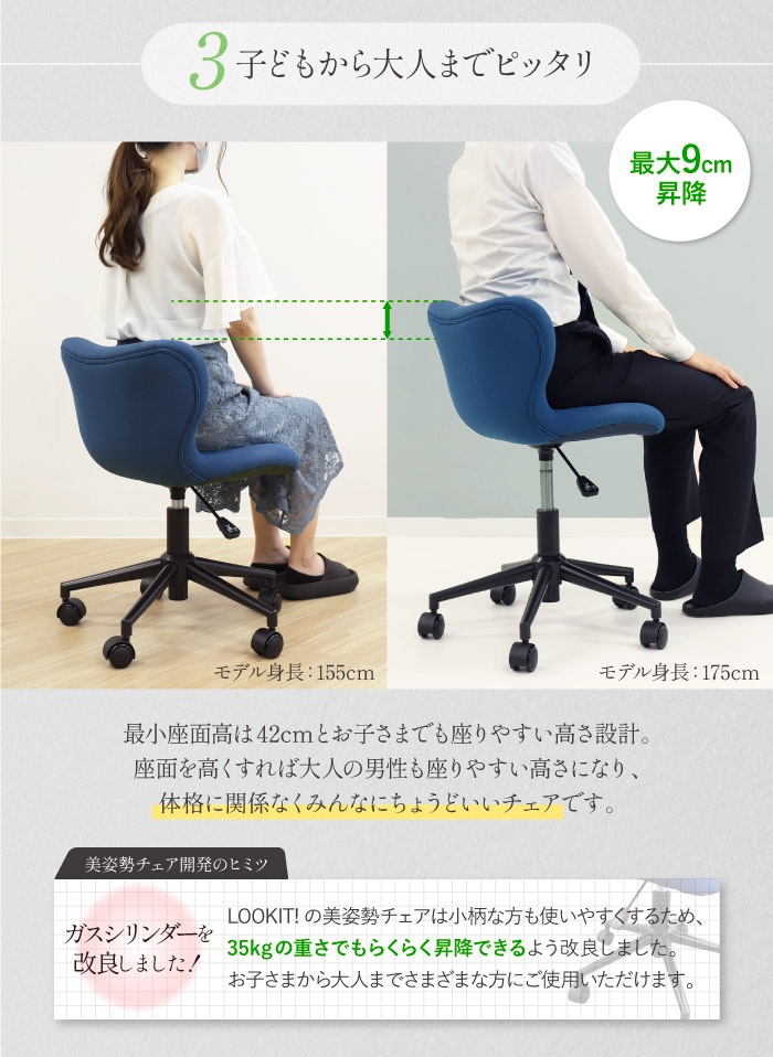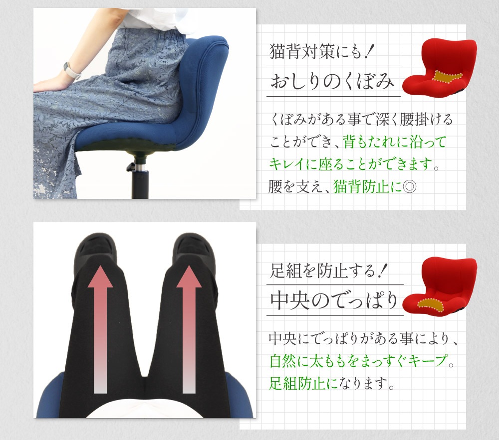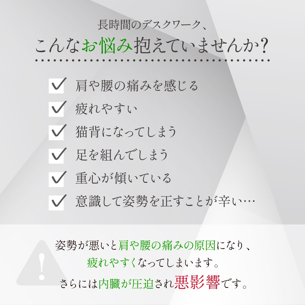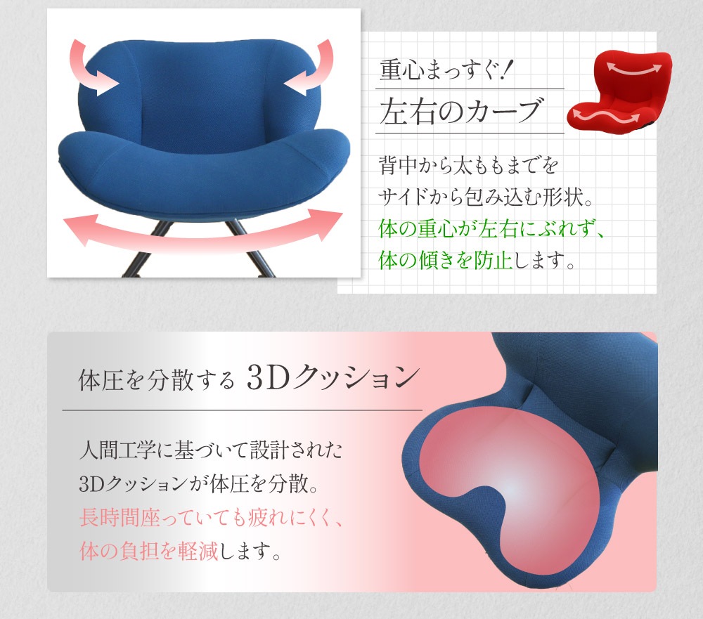 | 座るだけの腰痛対策、美姿勢チェア。 計算された特殊形状で、座った瞬間から姿勢を正し、デスクワークにまつわるお悩みを解決します。 おしりにくぼみがあり、深く腰かける事ができます。背もたれに沿ってキレイに座る事ができ、腰を支え猫背防止に。 中央にでっぱりがある事で、太ももをまっすぐキープ。足組み防止になります。 左右のカーブが背中から太ももまでを包み込みます。重心が左右にぶれず、体の傾きを防止します。 浅めの奥行で足の圧迫感を解消します。 柔らかすぎないウレタンクッションは長時間の作業に適した程よい硬さです。 最小座面高は42cmとお子さまでも座りやすい高さ設計。 圧迫感のないサイズ感と、おしゃれなデザインで、お部屋のインテリアとも相性抜群です。 |