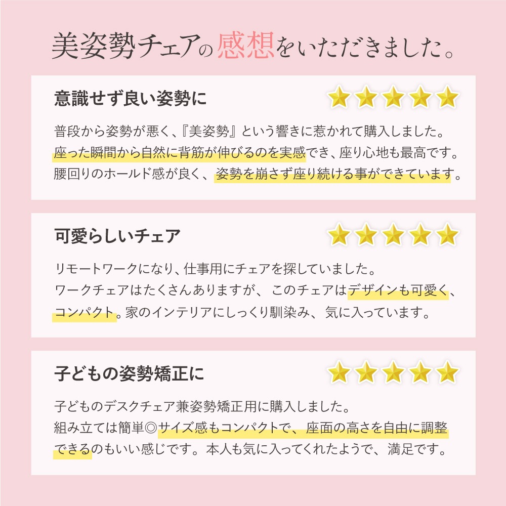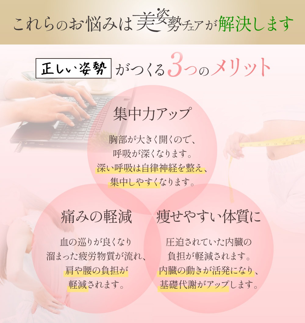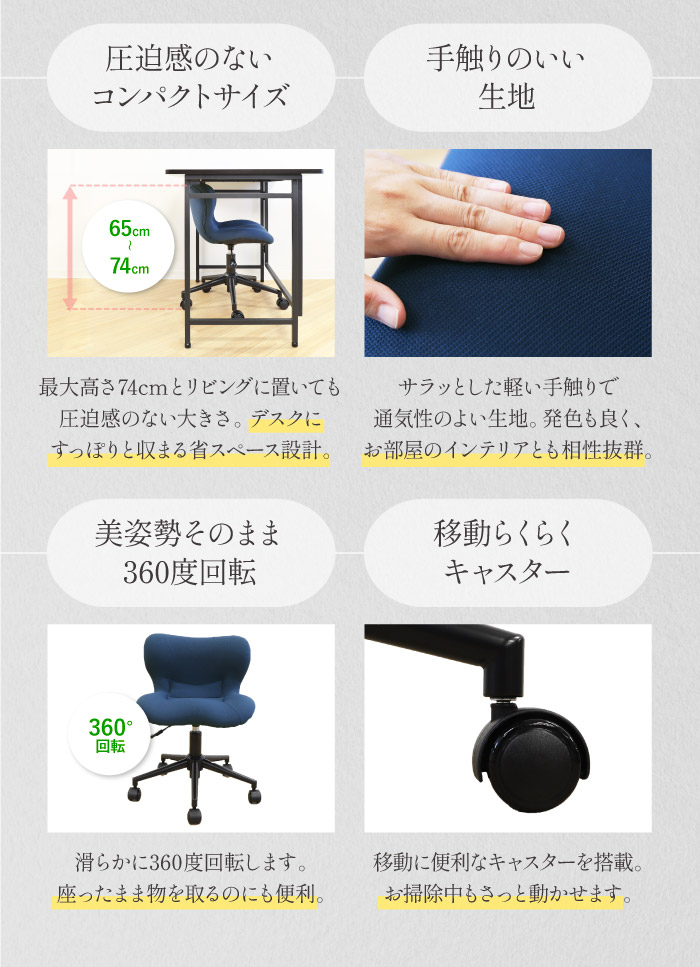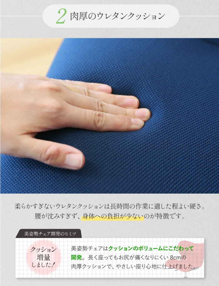 | 座るだけの腰痛対策、美姿勢チェア。 計算された特殊形状で、座った瞬間から姿勢を正し、デスクワークにまつわるお悩みを解決します。 おしりにくぼみがあり、深く腰かける事ができます。背もたれに沿ってキレイに座る事ができ、腰を支え猫背防止に。 中央にでっぱりがある事で、太ももをまっすぐキープ。足組み防止になります。 左右のカーブが背中から太ももまでを包み込みます。重心が左右にぶれず、体の傾きを防止します。 浅めの奥行で足の圧迫感を解消します。 柔らかすぎないウレタンクッションは長時間の作業に適した程よい硬さです。 最小座面高は42cmとお子さまでも座りやすい高さ設計。 圧迫感のないサイズ感と、おしゃれなデザインで、お部屋のインテリアとも相性抜群です。 |