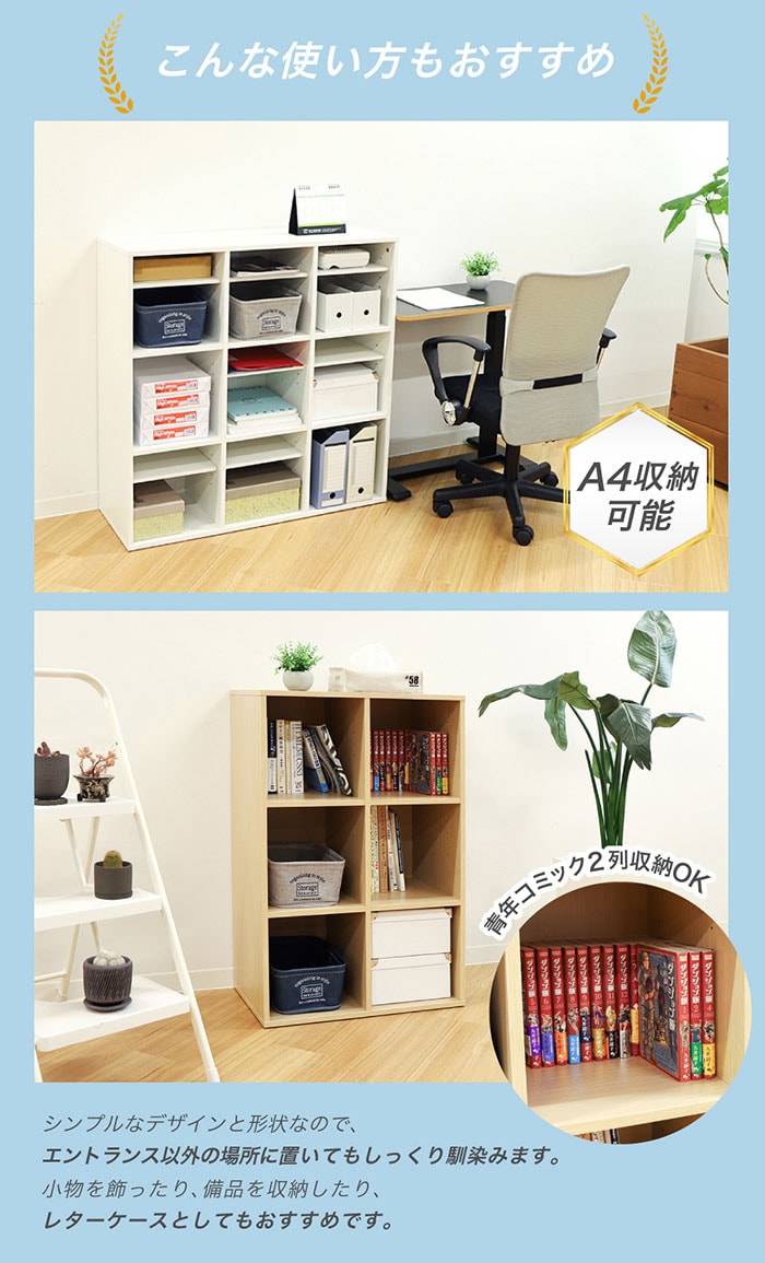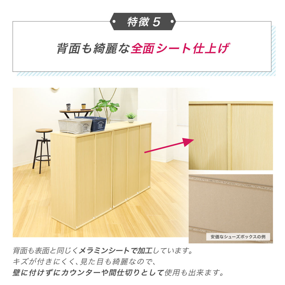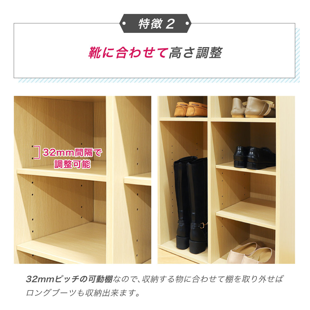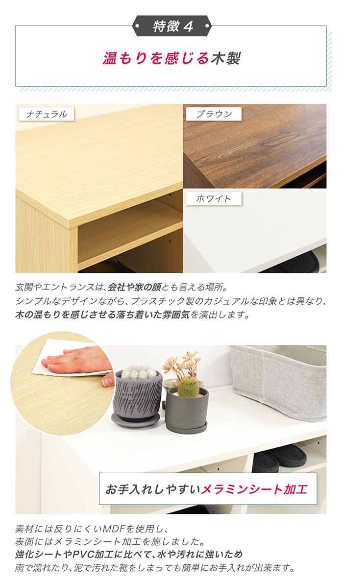 高さを調整出来る可動棚でロングブーツも収納できるシューズラックです。 扉のないオープンタイプなので、通気性が良く、匂いやカビの元となる菌の繁殖を抑え、靴を清潔に保管できます。 雨で濡れたり、泥で汚れた靴をしまっても簡単にお手入れが出来るメラミンシート加工を施したMDF材を使用。 シンプルながらも木の温もりを感じさせる落ち着いた雰囲気のデザインで、カラーはホワイト、ナチュラル、ダークブラウンの3色です。 シューズラックとしてだけでなく、小物を飾ったり、備品を収納したり、ディスプレイラックとしてもおすすめです。 |