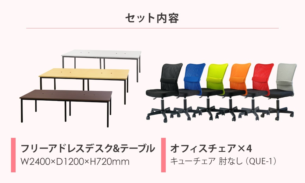 | 商品名 | フリーアドレスデスク&テーブル セット 4人用 幅2400mm + キューチェア(肘なし) |