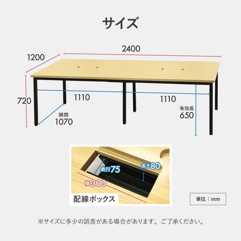 | サイズ | ■デスク 外寸:幅2400×奥行1200×高さ720mm 重量:約51 kg ■チェア 外寸:幅520×奥行640×高さ840~960(座面高420~540)mm 重量:6.4kg 梱包重量:570×190×500mm 梱包重量:7.5kg |