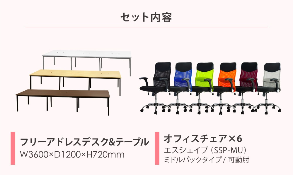 | 商品名 | フリーアドレスデスク&テーブル セット 6人用 幅3600mm + S-shapeチェア(ミドルバック 可動肘) |