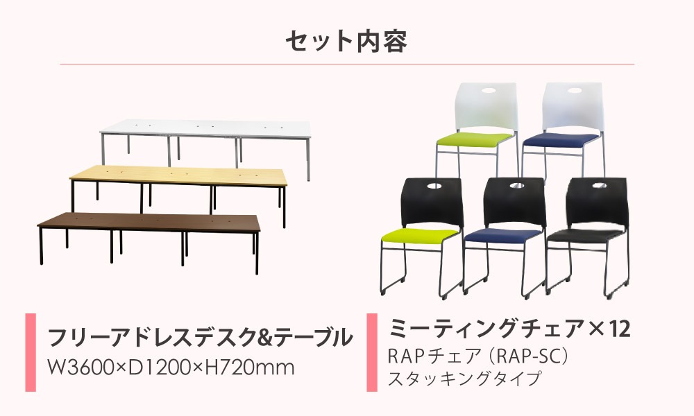 | 商品名 | フリーアドレスデスク&テーブル セット 12人用 幅3600mm + ラップ スタッキングチェア |