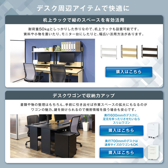 耐荷重も50kgとしっかりした作りなので、机上ラックの設置も可能です。 天板は便利な配線スリット付き。
