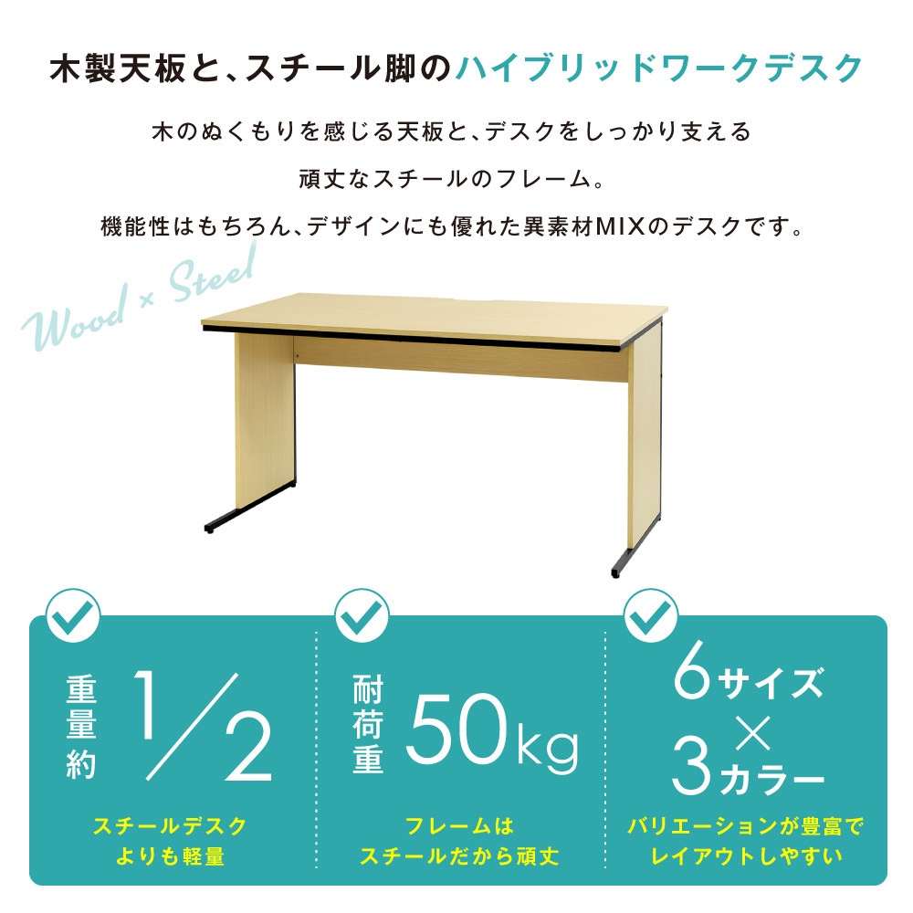 木のぬくもりを感じる天板と、デスクをしっかり支える頑丈なスチールのフレーム。機能性はもちろん、デザインにも優れた異素材MIXのハイブリッドワークデスクです。 天板、幕板、脚パネルはすべて同色のメラミンシート加工を全面に施しました。木材の特性である反りや割れを防ぎ、頑丈で長く使える耐久性があります。 耐荷重も50kgとしっかりした作りなので、机上ラックの設置も可能です。 天板は便利な配線スリット付き。 豊富なバリエーションでレイアウトがしやすく、オフィスはもちろん教育機関やご自宅など、多様に使えます。 |