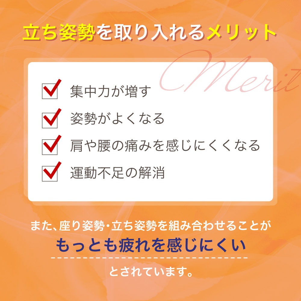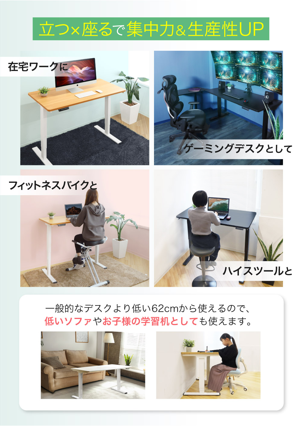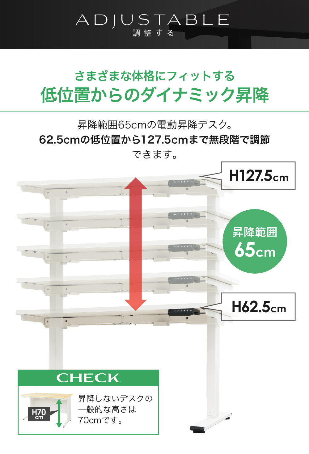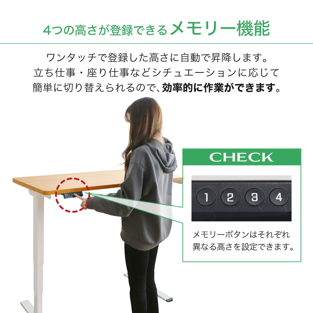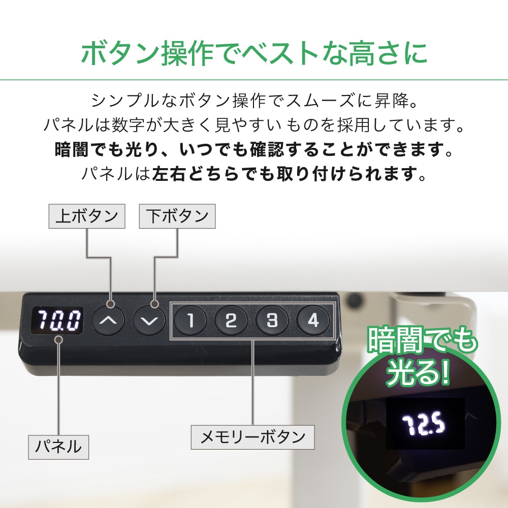 昇降範囲が広い電動昇降デスクです。 4つの高さが記憶できるメモリー機能付き。ワンタッチで立ち仕事、座り仕事などシチュエーションに応じて高さを切り替えられます。 衝撃を感知すると約3cm逆方向に昇降する安全センサー付きで、挟み込みを防止します。 静音性・安定性に優れたダブルモーターを搭載。昇降スピードも速く、ストレスのない昇降を実現。 パネルは数字が大きく見やすいものを採用。暗闇でも光ります。 脚2色、天板2色を自由に組み合わせることができる6色展開で、シーンに合ったカラーが選べます。 |